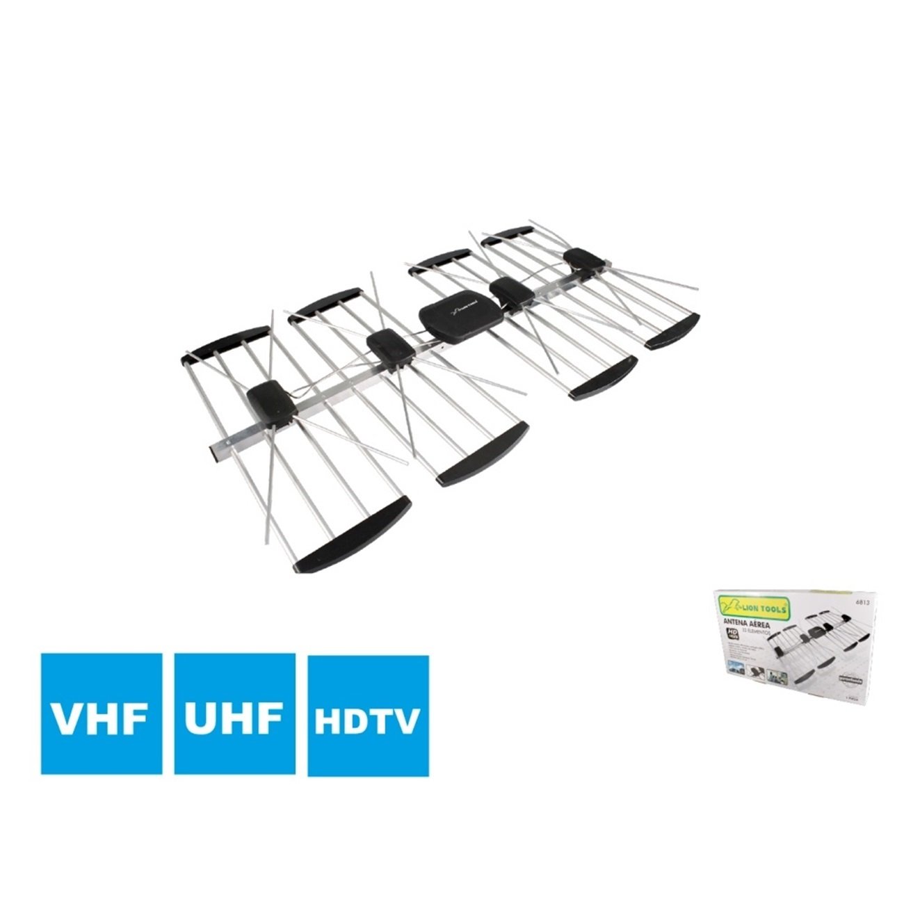 Antena area 32 elementos lion tools se instala en exteriores, se emplea para captar señales de televisión digital en alta definición. Este tipo de antena recibe canales de televisión abierta a larga distancia, lo que la hace ideal para casas o negocios en zonas rurales o áreas donde la señal es más débil.