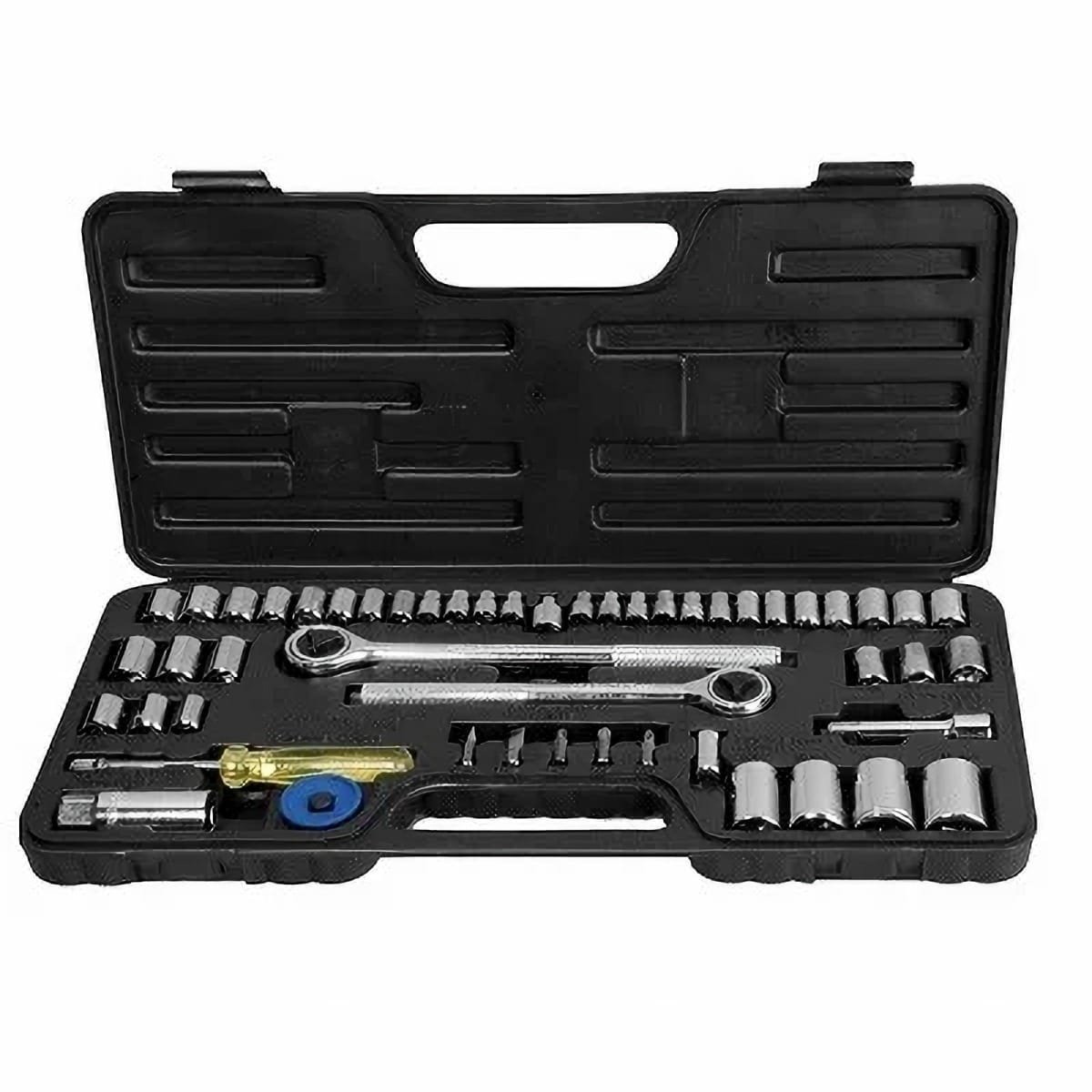 Incluye matracas de diferentes medidas (1/4″, 3/8″ y 1/2″), extensiones, adaptadores, dados en sistema estándar (SAE) y milimétrico (mm), además de puntas para desarmador, lo que lo convierte en un kit versátil y multifuncional.