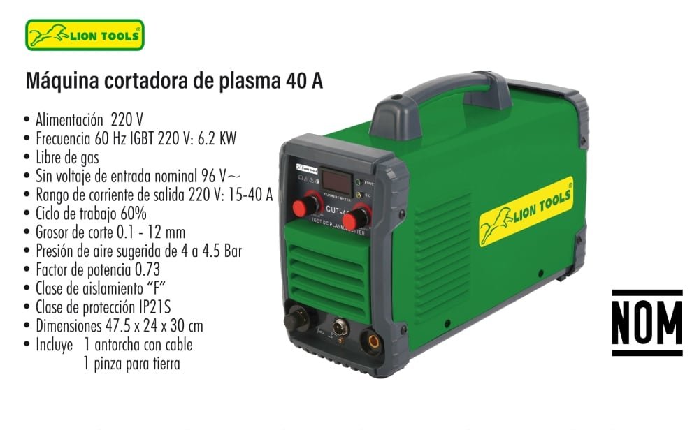 Código: LION-5039 | Marca Lion tools | Corriente 40 A | Bornes 3/8″ | Frecuencia IGBT | Peso 6.8 kg | Alimentación 220 V | Frecuencia 60 Hz IGBT 220 V~. 6.2 W | Libre de gas | Sin voltaje de entrada nominal 96 V~ | Rango de corriente de salida 220 V: 15~40 A | Ciclo de trabajo 60 | Grosor de corte 0.1 – 12 mm | Presión de aire sugerida de 4 a 4.5 Bar | Factor de potencia 0.73 | Clase de aislamiento «F» | Clase de protección IP21S | Incluye 1 antorcha con cable, 1 pinza para tierra