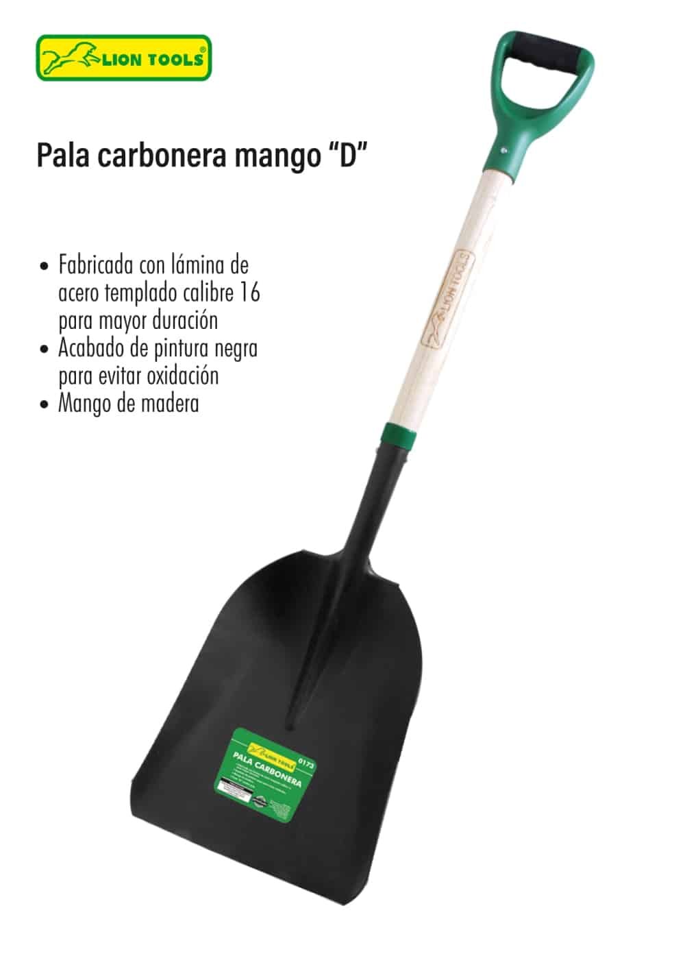 Código: LION-0173 | Fabricada con lamina de acero templado calibre 16 | Acabado de pintura negra que evita la oxidación | Mango de madera | Empuñadura confort grip