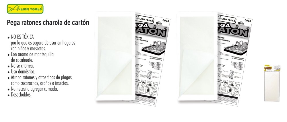 Código: LION-0016 | Incluye 2 trampas de ratón | Medidas 13.4 x 28 cm | No es tóxica | Con aroma a mantequilla de cacahuate que atrae a los ratones | No se chorrea | Uso doméstico | Atrapa ratones, cucarachas, arañas e insectos | Desechables