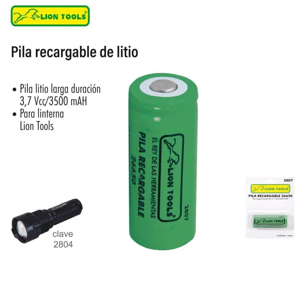 Código: LION-2807 | Pila de litio larga duración 3.7 Vcc/3500 mAH | Para linterna lion tools