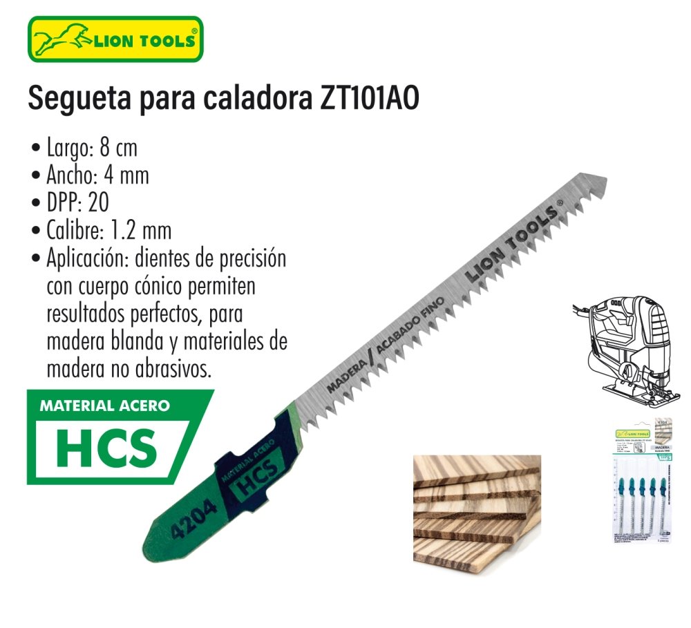 Código: LION-4204 | Corte 1.5 – 15 mm | Acabado fino | Unidad de venta 5 piezas | Largo 8 cm | Ancho 4 mm | DPP: 20 | Calibre 1.2mm |Aplicación: Dientes de precisión con cuerpo cónico permiten resultados perfectos para madera blanda y materiales de madera no abrasivos | Material de acero HCS