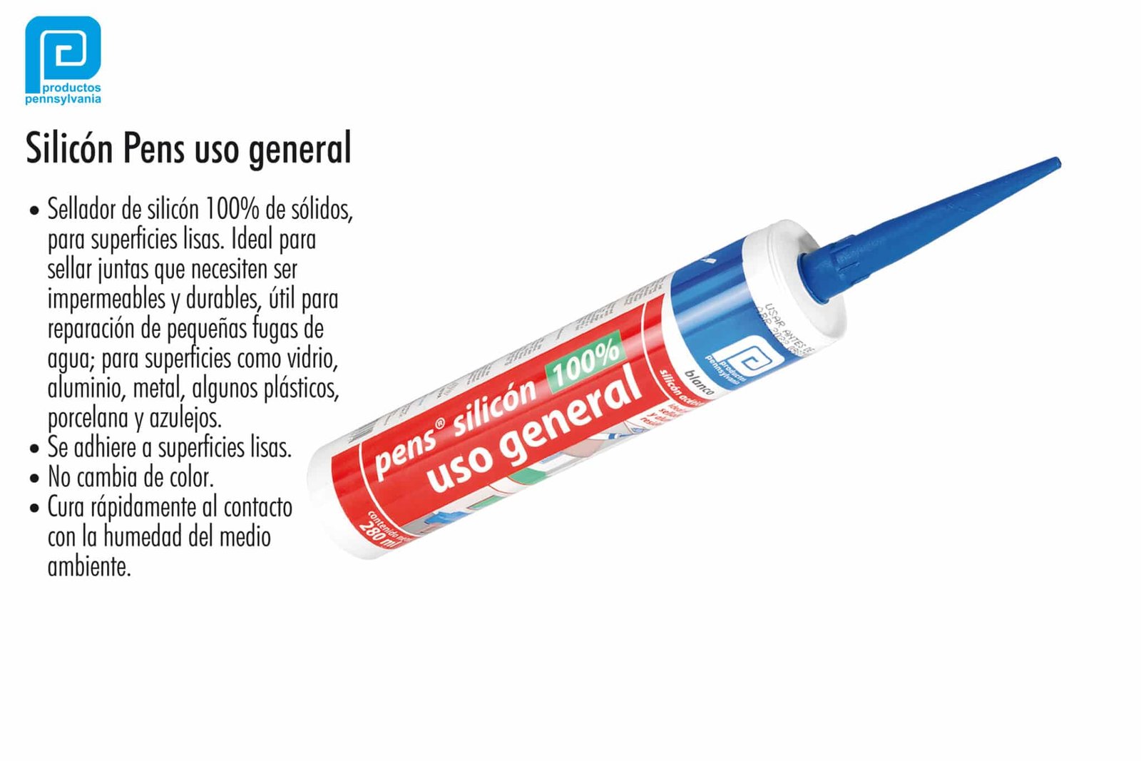 Código: LION-5473 | Marca Productos Pennsylvania | Transparente | Peso 280ml | Sellador de silicón 100% de sólidos, para superficies lisas | Ideal para sellar juntas que necesiten ser inpermeables y durables, útil para reparación de pequeñas fugas de agua: para superficies como vidrio, aluminio metal, algunos plásticos, porcelana y azulejos. | Se adhiere a superficies lisas. | No cambia de color. | Cura rápidamente al contacto con la humedad del medio ambiente.