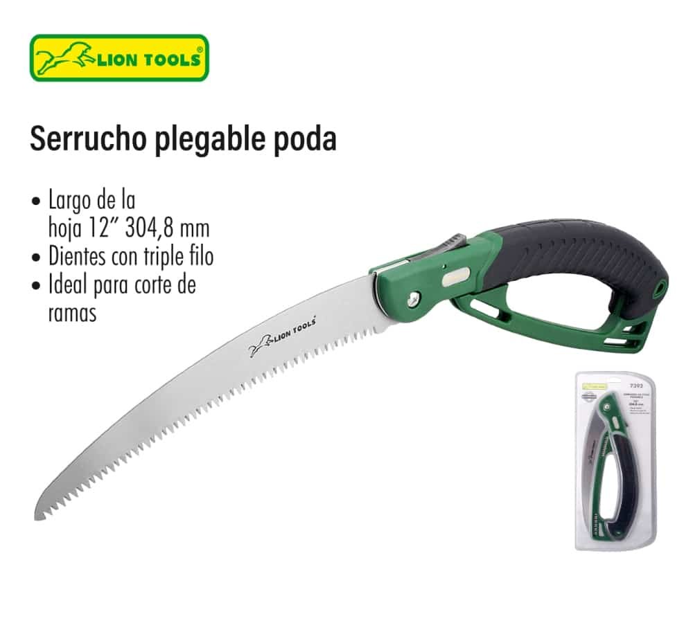 Código: LION-7392 | Marca Lion tools | Largo de la hoja 12″ 304,8 mm | Dientes con triple filo | Ideal para corte de ramas. | Mango de plástico