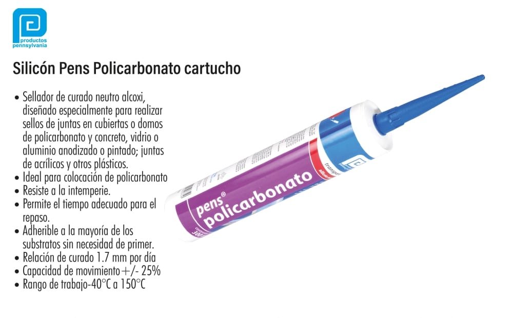 Código: LION-9775 | Marca Productos Pennsylvania | Peso 300ml | transparente | Sellador de curado neutro alcoxi, diseñado especialmente para realizar sellos de juntas en cubiertas o domos de policarbonato y concreto, vidrio o aluminio anodizado o pintado; juntas de acrílicos y otros plásticos. | Ideal para colocación de policarbonato | Resiste a la intemperie. | Permite el tiempo adecuado para el repaso. | Adherible a la mayoría de los substratos sin necesidad de primer. | Relación de curado 1.7 mm por día | Capacidad de movimiento+/- 25% | Rango de trabajo-40°C a 150°C
