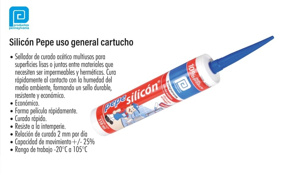 Código: LION-2389 | Marca Productos Pennsylvania | Peso 280ml | transparente Sellador de curado acético multiusos para superficies lisas o juntas entre materiales que necesiten ser impermeables y herméticos. Cura rápidamente al contacto con la humedad del medio ambiente, formando un sello durable, resistente y económico. | Forma película rápidamente. | Curado rápido. | Resiste a la intemperie. | Relación de curado 2 mm por día | Capacidad de movimiento+/- 25% | Rango de trabajo -20°C a 105°C