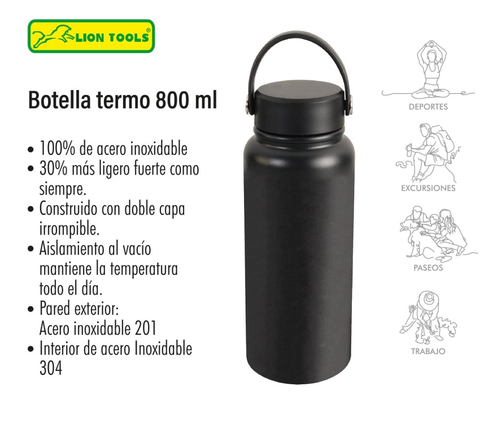 Código: LION-8330 | Marca Lion tools | Peso 395 g | Medidas A: 9 cm x B: 24 cm | 30% más ligero fuerte como siempre. | Construido con doble capa irrompible. | Aislamiento al vacío mantiene la temperatura todo el día | Pared exterior: acero inoxidable 201 | Interior de acero inoxidable 304
